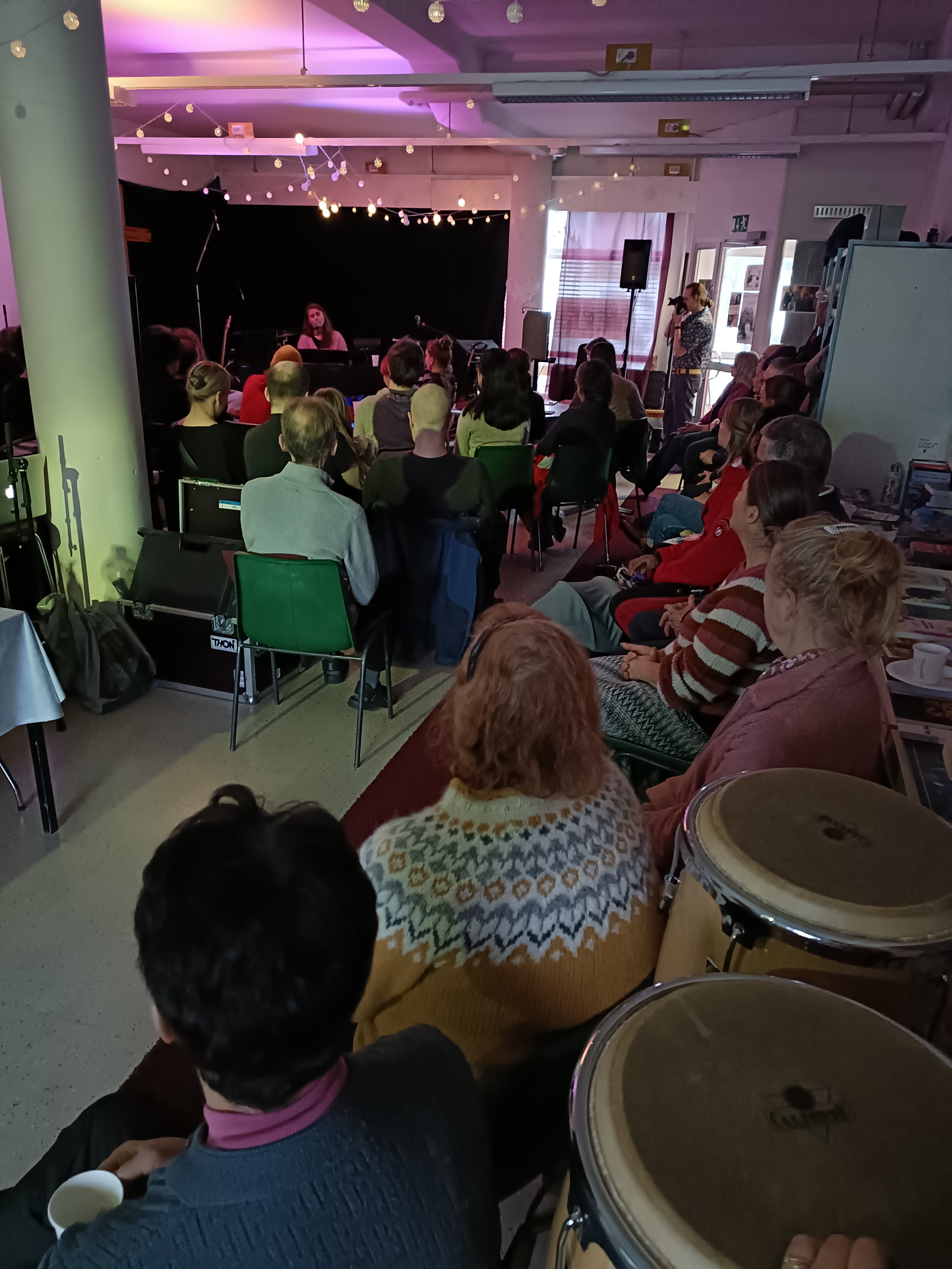 We managed to finish all our setup and soundchecks at 15:30 (3:30pm), 16:00 (4pm) being the showtime. Barely any people were showing at that time, but all of a sudden the space started to fill up and was crowded when it was time for Satu to open with her set! Pastor Sanna was very surprised to only recognise a few familiar faces, which were mainly the volunteers who set up the coffee and snacks at the back. Satu shared some very touching stories to her finnish songs. Then it was time to welcome Haydé on stage. She accompanied herself with the piano like Satu, but also used some backing tracks to bring in the orchestral arrangements of her songs. After Haydé it was our turn and Satu occupied the sound desk, so Eero could join us on stage. It still surprises me how attentively finnish people listen to live music. Especially me sharing the stories behind a couple of songs had people even more engaged and also helped them to understand the songs lyrically. Tears, laughter and singalong. All of it happened and we got to close off the show with Haydé back on stage with the collab song.