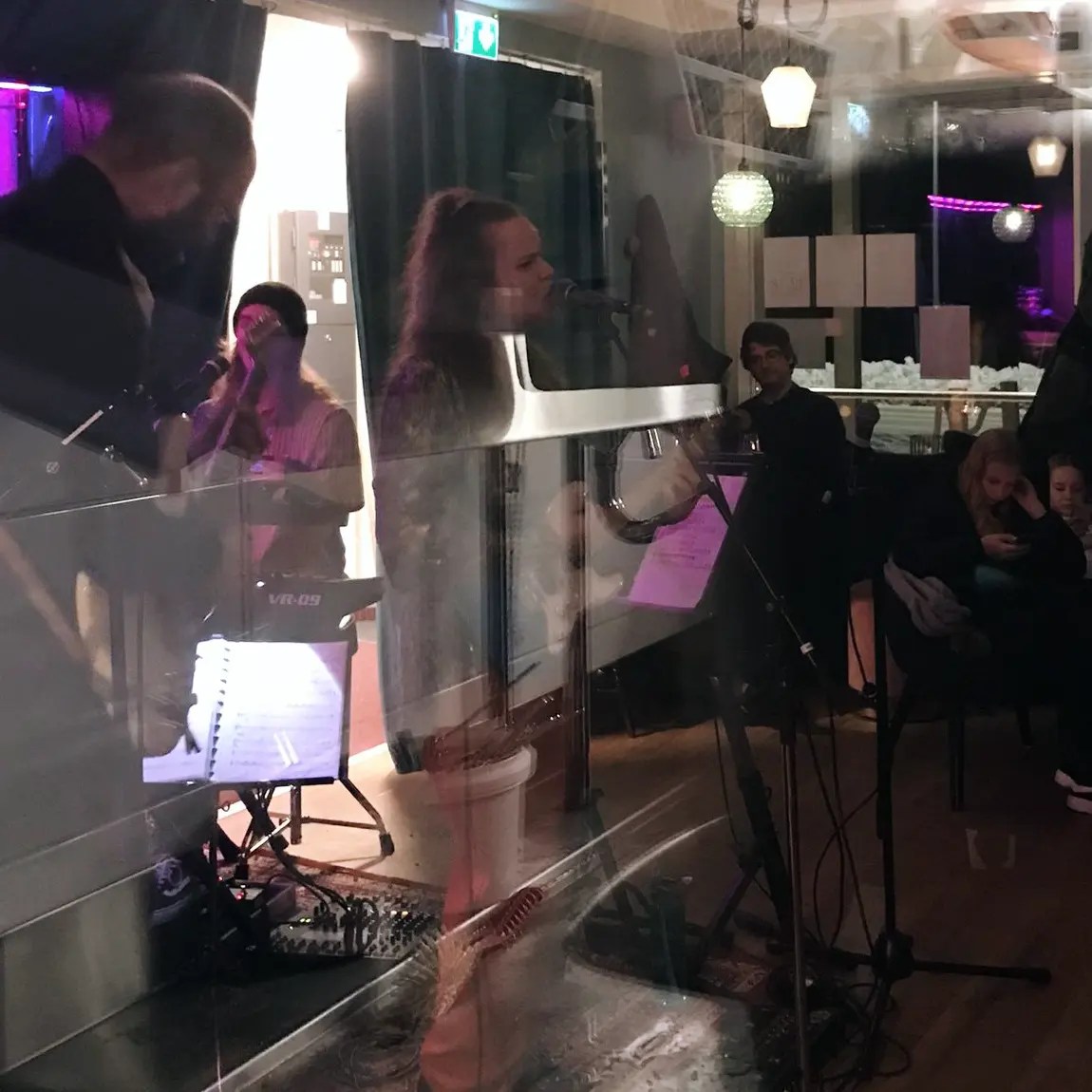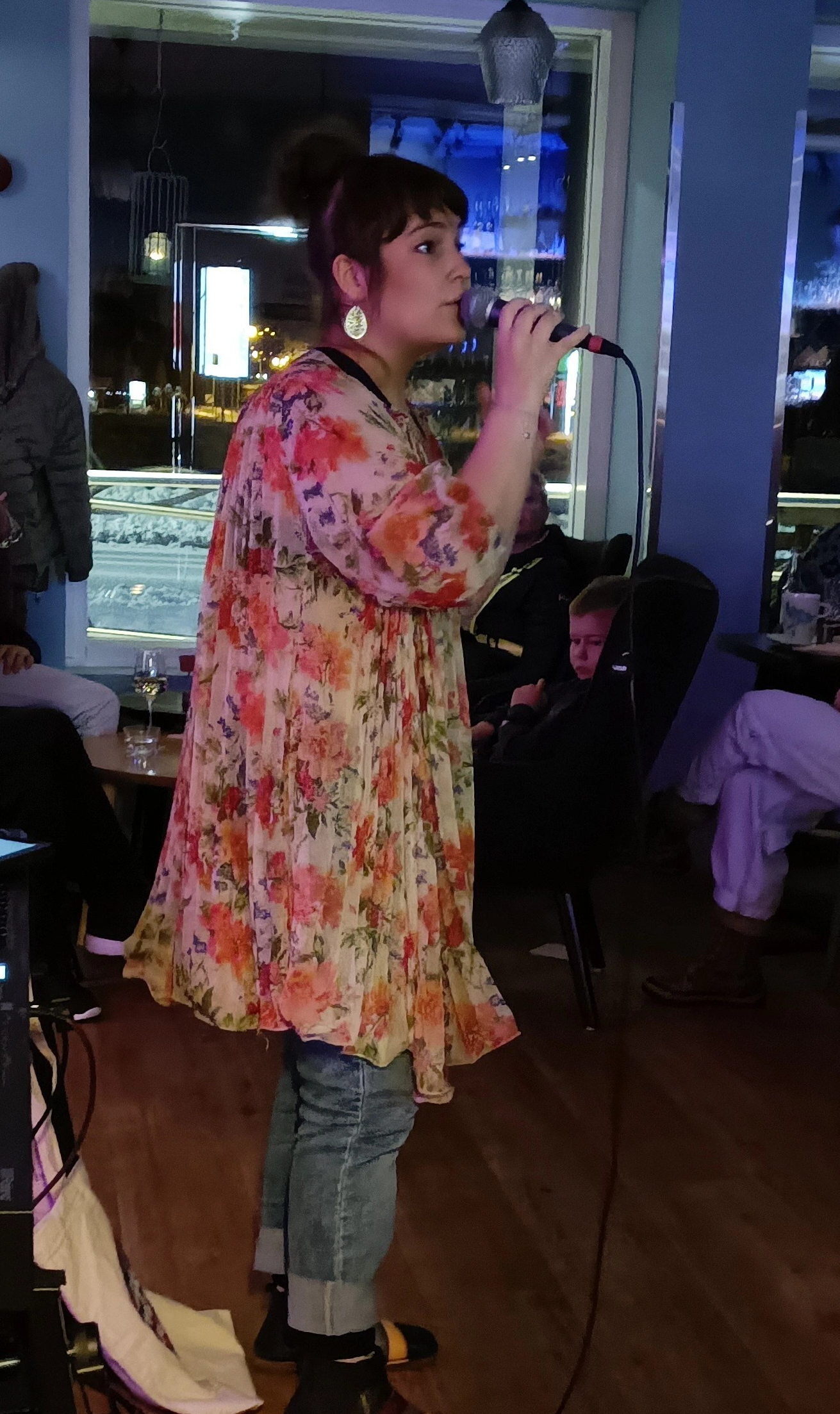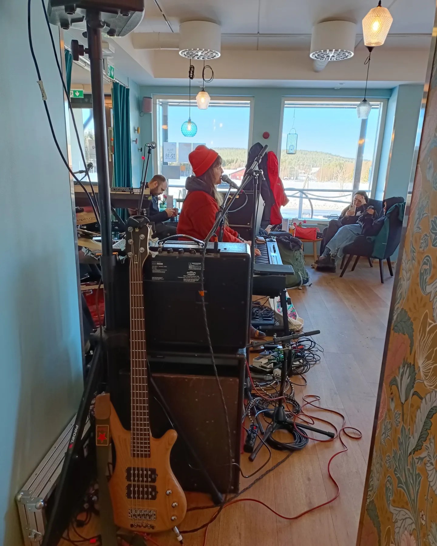 A couple hours later we arrived in Ylläs and met Jo who was very accommodating to us. Even though we didn’t have the biggest space available, we managed to create a cosy stage area next to the entrance with Jo’s help. During our soundcheck we got a group of ladies celebrating a round birthday. They were happy for us to take more time for our soundcheck even though we tried to wrap up before lunch business. After Haydé had finished her soundcheck we were ready to get some groceries and check into our accommodation, which Taavi’s friend had organised for the whole team at the last minute. This was the first time that we had a proper downtime before performing. Some of us slept, others had a Sauna or played games. As I was waking up from my nap, I had the pre-gig insecurities hitting. After the Sunday’s gig we noticed that it is important to share the meaning behind all the songs and I was trying to get straight to the point. While some of the guys made dinner, I sat down with Naja to talk about the meanings behind the songs. It was a good conversation as it brought back a bit of perspective into why I share the songs in the first place.